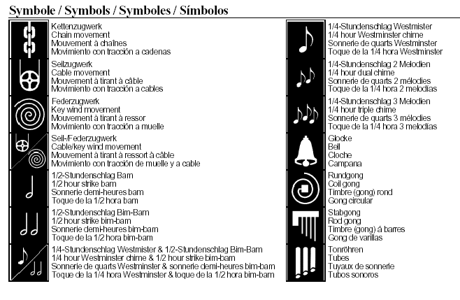 second indication for pendulum lengths under 116 cm; automatic beat adjustment, nighttime shut-off systems for 1/2-hour and 1/4-hour