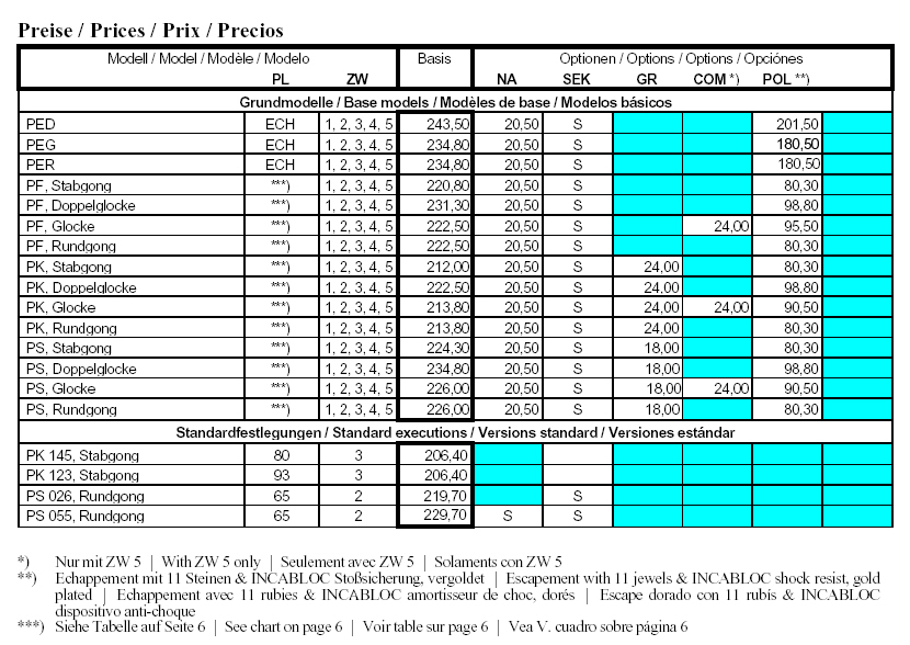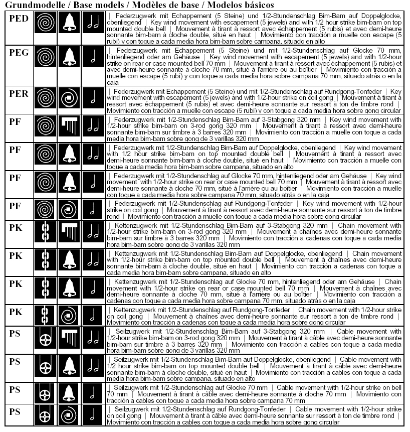 Plate size 114 x 99 x 2,0 mm, key wind movements with 4 bronze bushings (2nd wheel) and anti snap-back system, mantel clock version with escapement (Swiss escapement), pendulum version with Kieniramic7 solid anchor with stationary escapement (Graham) and automatic beat adjustment, strike shut-off, front winding, without upper support brackets