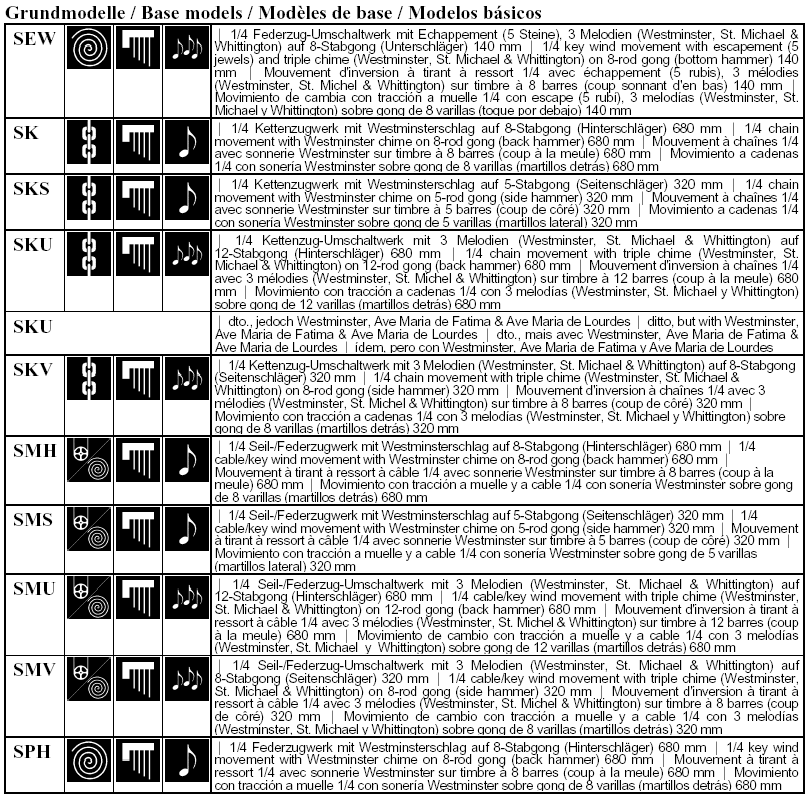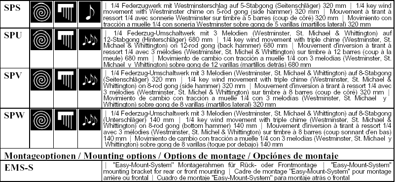 Mesure de platine 120 x 124 x 1,7 mm, mouvements à tirant à ressort avec 4 oú 6 bouchons en bronze (pignons adjoints), barrillets avec demi-arbre et dispositif d'encliquetage de sûreté, version d'horloge de table avec échappement (échappement suisse), version de pendule avec Kieniramic7ancre solide avec échappement de repos (Graham) et dispositif d'ancre automatique, mouvement d'inversion à tirant à ressort à câble avec délimitatien mécanisme de remontage à cable, invalidation de sonnerie, mécanisme de remontage frontal